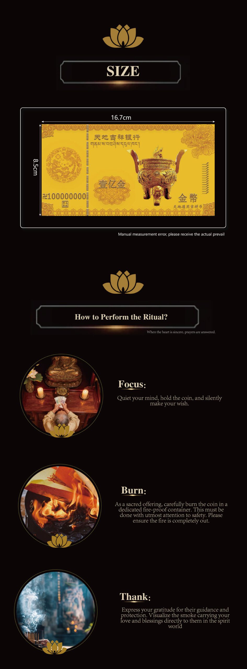 A meaningful and emotionally charged way of paying tribute, used to remember and bless deceased loved ones. Pray for blessings and protection, pray for prosperity. Each "paper money" is infused with bright colors and exquisite designs, symbolizing prosperity, good luck and the continuation of ancestral heritage.It is widely used in ceremonies, ancestral altars, ancestral birthdays, especially for energy connections with loved ones in heaven, and for decorating rooms to drive away ghosts and evil.